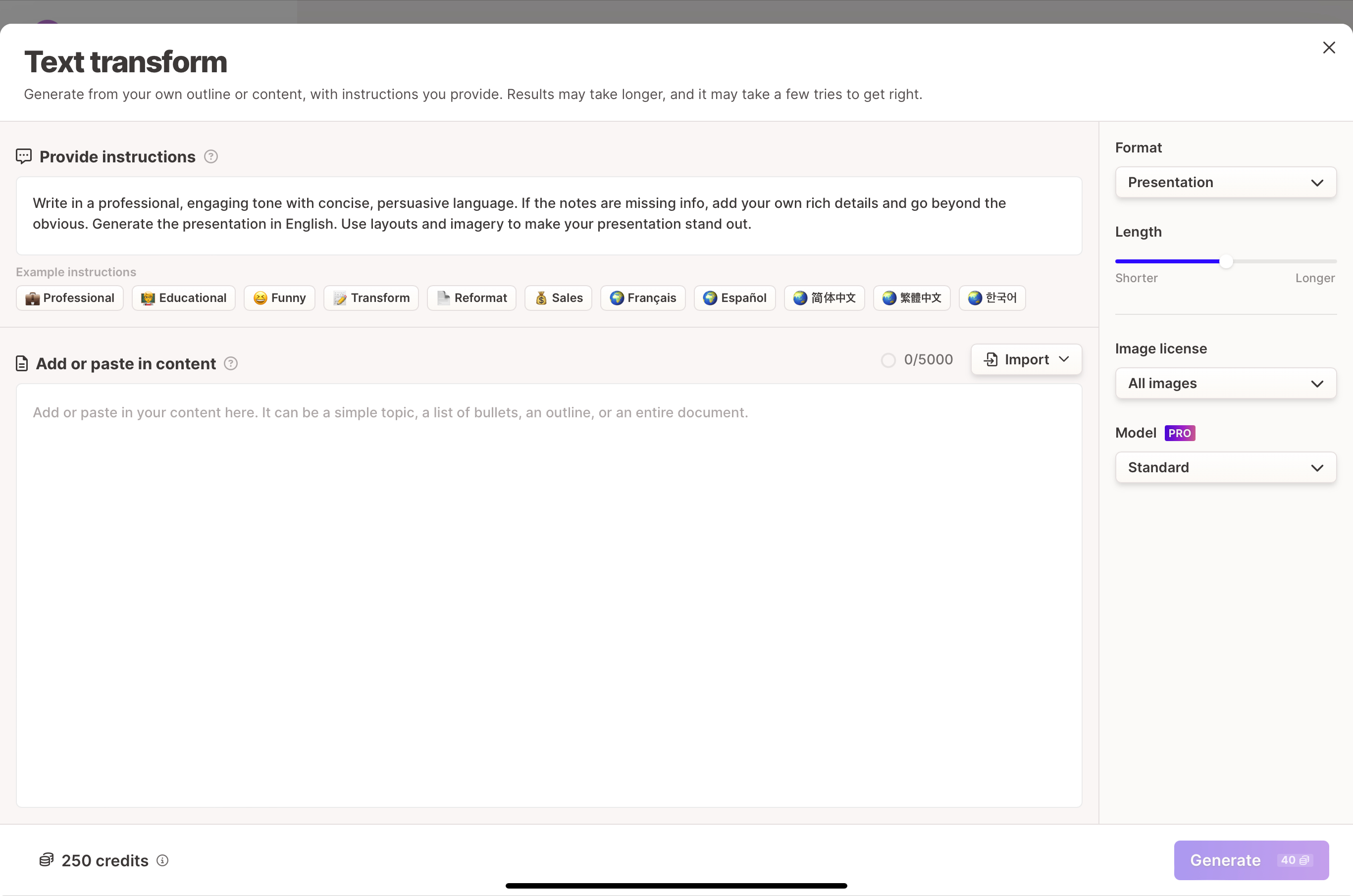 Generate를 선택하면 자료 만드는 대화 창이 나오고 프레젠테이션/도큐먼즈/웹페이지 중 원하는 양식을 고르면서 시작.